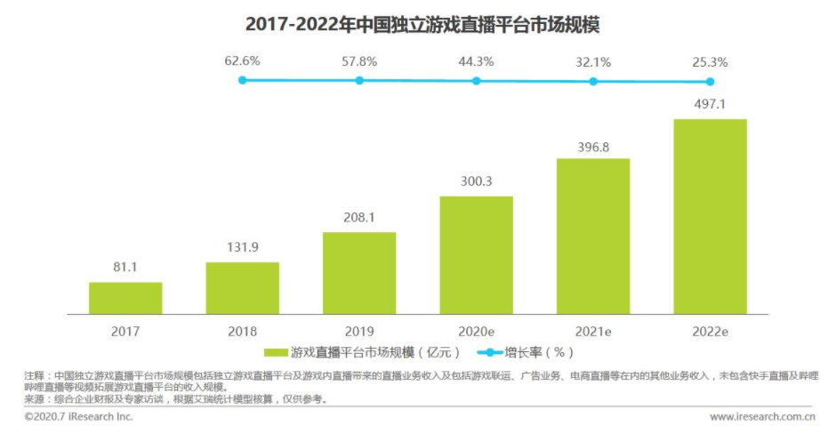 从市场角度看来,近年的游戏直播市场规模仍在高速增长,但在市场到达一定规模的情况下,市场规模增速放缓是正常现象。据数据显示,2022年游戏直播市场预期将达到497.1亿元,在屡次打破行业预期的直播行业来说,这并非不可达到的数字。