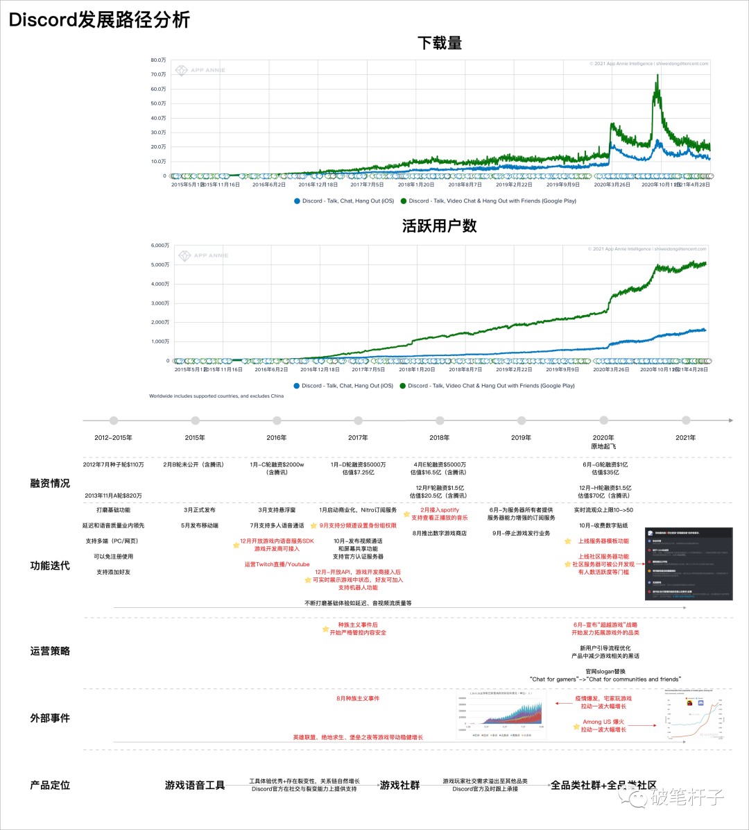 导读:Discord是当今风头正盛的实时交流社群产品,估值已超过100亿美元。在多达9轮至少5亿美元的融资中腾讯的身影连续多次出现。本文尝试用一图说清Discord的整个发展轨迹,进而从中探寻百亿美元估值炼成的一些关键要素。